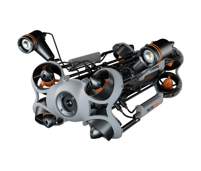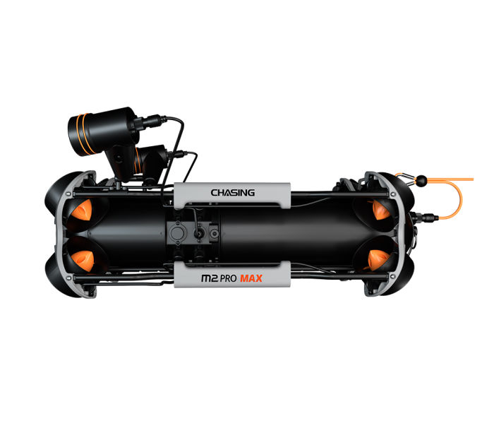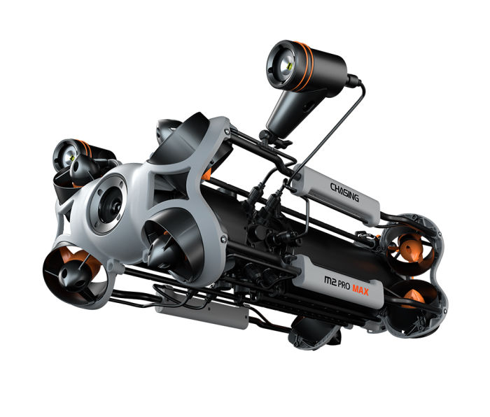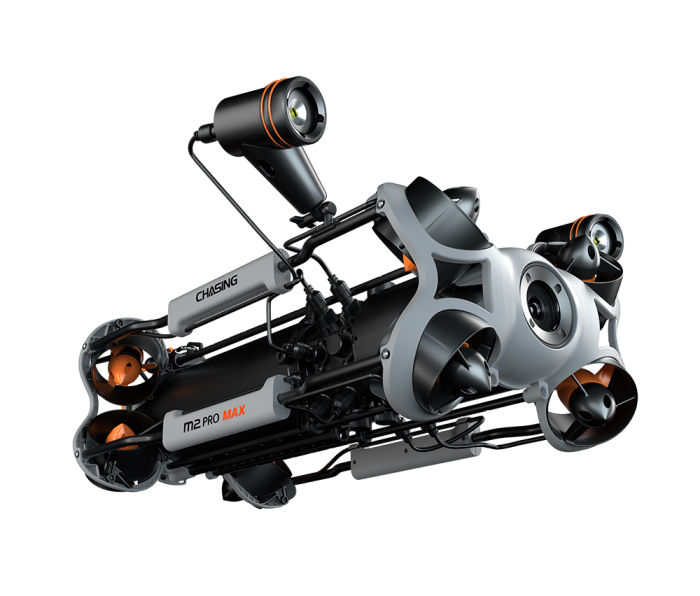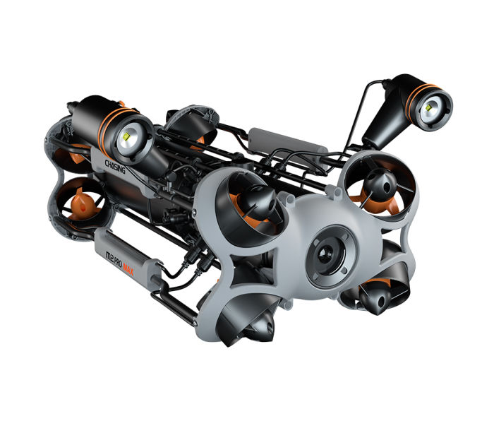 CHASING M2 PRO MAX is an industrial-grade underwater remote operated vehicle (ROV) designed for government and enterprise users. It is equipped with eight vectored thrusters, allowing 360-degree omnidirectional movements. The ROV can dive to 200 meters deepwater, and move around a maximum horizontal radius of 400 meters.